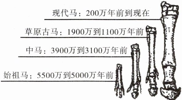 3. 如下图所示,科学家通过比较与马相似动物的骨骼化石及它们的生存时期,认为它们是现代马的祖先。不能直接从图示中获得的演化证据是( )。