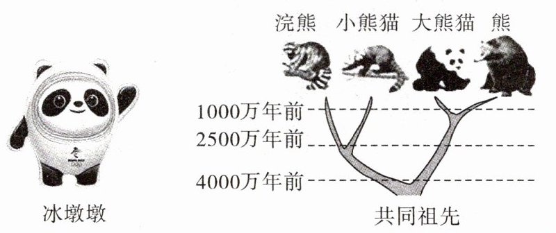 8. (2022·烟台)北京冬奥会的吉祥物“冰墩墩”的造型取自国宝大熊猫。大熊猫体型与熊相似,而面相又与小熊猫和浣熊相近。它们之间的亲缘关系如何? 下图是科学家根据DNA分析,显示的四种动物的进化历程。下列结论不正确的是( )。