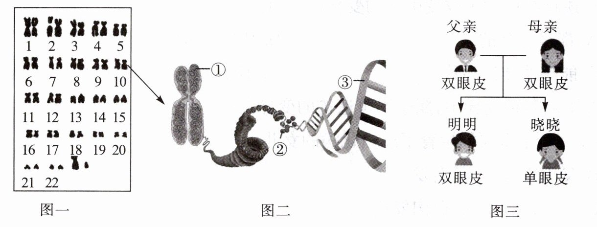 (3)生物的性状是由 (填图二中序号)上具有遗传效应的片段控制的,但明明与其父亲的双眼皮表现并不完全相同,一个表现明显,另一个表现不明显,可见生物体的许多性状表现是 共同作用的结果。