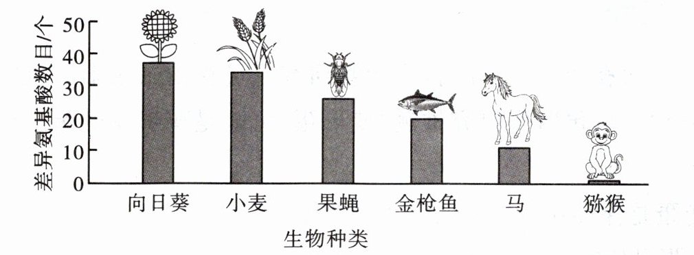 5. (2024·河南)比较各种生物的同一种蛋白质(如细胞色素c)的氨基酸组成,可判断它们之间的亲缘关系。几种生物的细胞色素c与人类的相比,存在差异的氨基酸数目如图所示,其中与人类亲缘关系最近的是( )。