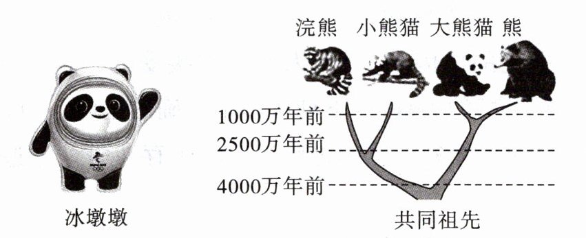 7. (2022·烟台)北京冬奥会的吉祥物“冰墩墩”的造型取自国宝大熊猫。大熊猫体型与熊相似,而面相又与小熊猫和浣熊相近。它们之间的亲缘关系如何? 下图是科学家根据DNA分析,显示的四种动物的进化历程。下列结论不正确的是( )。