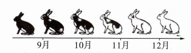 9. (2021·河南)雪兔生活在高纬度地区,随季节更替有“换装”行为。如图所示为雪兔的毛色由深到浅的“换装”过程。关于此行为的说法不正确的是( )。