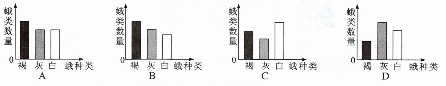 10. 真菌使某森林中树干的颜色由褐色变成灰白色。多年以后,此森林中不同颜色的蛾类最可能的数量变化结果是( )。