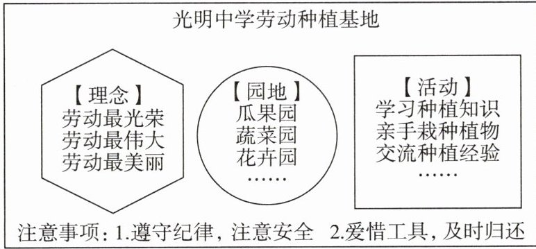 10. 学校将接待一批来参观该校劳动实践基地的嘉宾。作为该校的讲解员的你,请从下面的展板中提取有效信息,向嘉宾介绍劳动实践基地的特色。