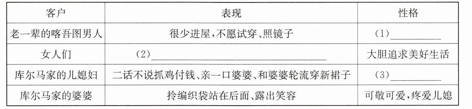 4.“我们”的裁缝店来往的客人很多,他们的性格也截然不同,阅读文章,梳理表格。