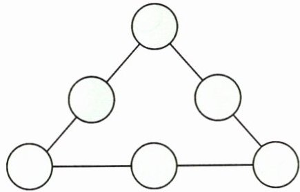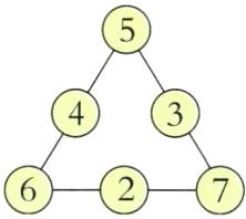 6. 在下面的○里填入2、3、4、5、6、7,使每条边上三个数的和都是15。
