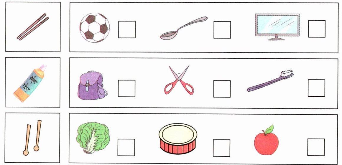 2. 在右边的物品中选出与左边物品相关的物品,在$\Box$里画“√”。