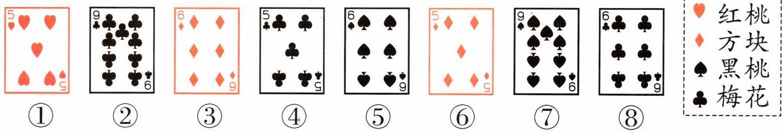 提示可以从扑克牌的颜色、上面的数字、图形这几个不同的特征来进行分类。