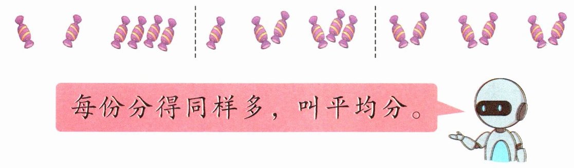 )块分成了3份。像右边的糖果这样,每份分得同样多,正好分完,这就是平均分。完全解答 把6块糖分成3份,可以分成1块、1块、4块,也可以分成1块、2块、3块,还可以分成2块、2块、2块。
