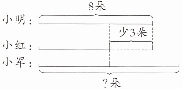 小明少3朵”,可以先求出小红做了多少朵,再求小军做的朵数。