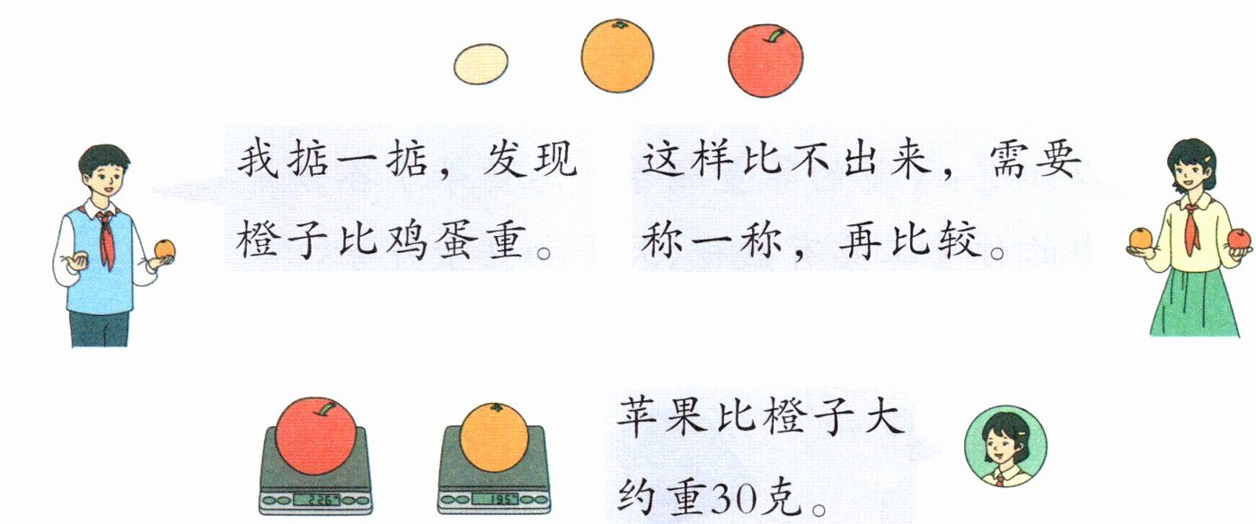 过程探索 (1)我们找来一些常见物品,比一比,称一称。如鸡蛋、橙子和苹果等。