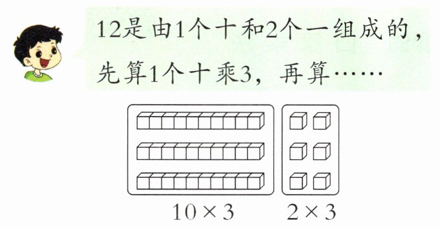 (2)$12×4的口算方法与12×3$的口算方法相同,利用数的组成口算。$12= 10+2$,$10×4= 40$,$2×4= 8$,$40+8= 48$,所以$12×4= 48$。