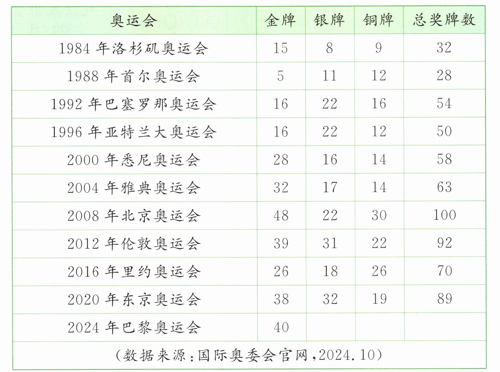 7. 新情境 奥运会 自1984年洛杉矶奥运会至今,中国体育代表团已经参加了11届夏季奥运会,取得了举世瞩目的骄人成绩(见表)。2024年的巴黎奥运会创造了境外夏季奥运会金牌总数最多记录;总奖牌数比1984年洛杉矶奥运会总奖牌数的3倍少5枚。中国体育代表团在2024年巴黎奥运会获得的总奖牌数是()枚。
