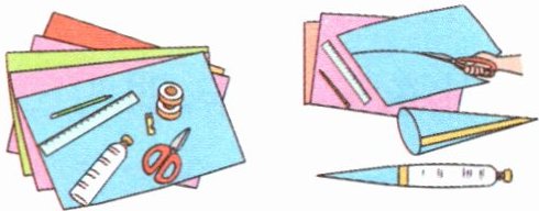 4. 火箭头制作 做水火箭头就是在硬卡纸上剪出一个扇形,然后做成圆锥,固定在水瓶的底端。制作水火箭的箭头,需要准备一些硬彩纸,每张彩纸长25厘米,宽比长短3厘米。