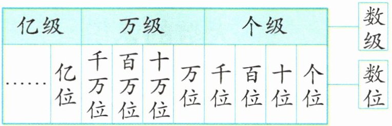 在用数字表示数的时候,这些计数单位要按照一定的顺序排列起来,它们所占的位置叫作数位;按照我国的计数习惯,从右边起,每四个数位是一级;把数位按照从低到高、从右到左的顺序排列起来,可制成数位顺序表。如下: