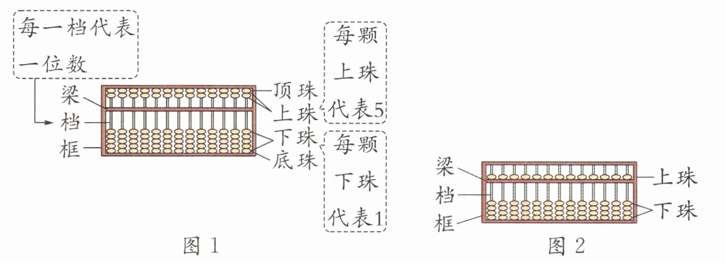 传统的算盘是2颗算珠在梁上,5颗算珠在梁下。如图1。