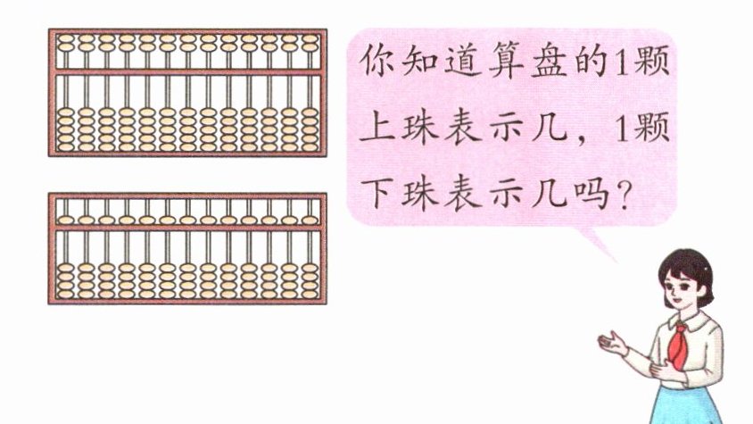 过程探索 通过交流,丰富对算盘的认识。根据最后2幅算盘图,写出上面表示的数。
