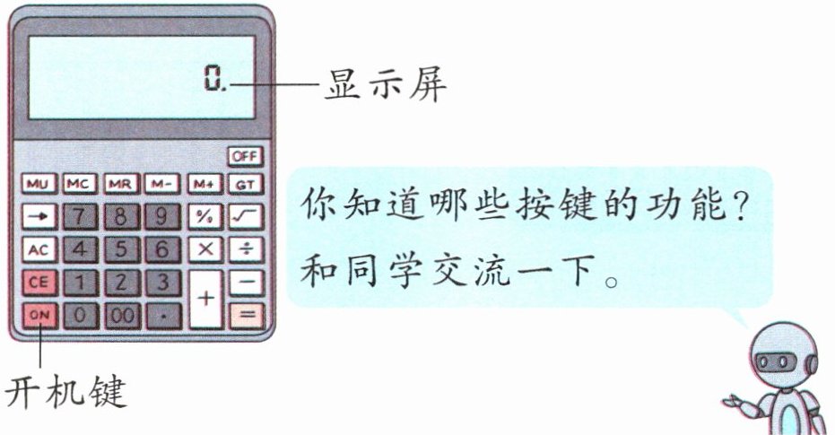 过程探索 题中呈现了计算器的实物图,并标注介绍了显示屏及开机键的名称,其余键的功能则需要我们自己探索、交流,通过了解常用键的功能和使用方法,为用计算器作准备。