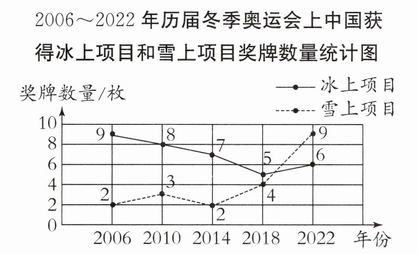 (3)下一届冬季奥运会中国冰上项目和雪上项目获得奖牌数还会增加,因为 2022 年冰上项目和雪上项目获得奖牌数都呈上升趋势。(理由合理即可)
