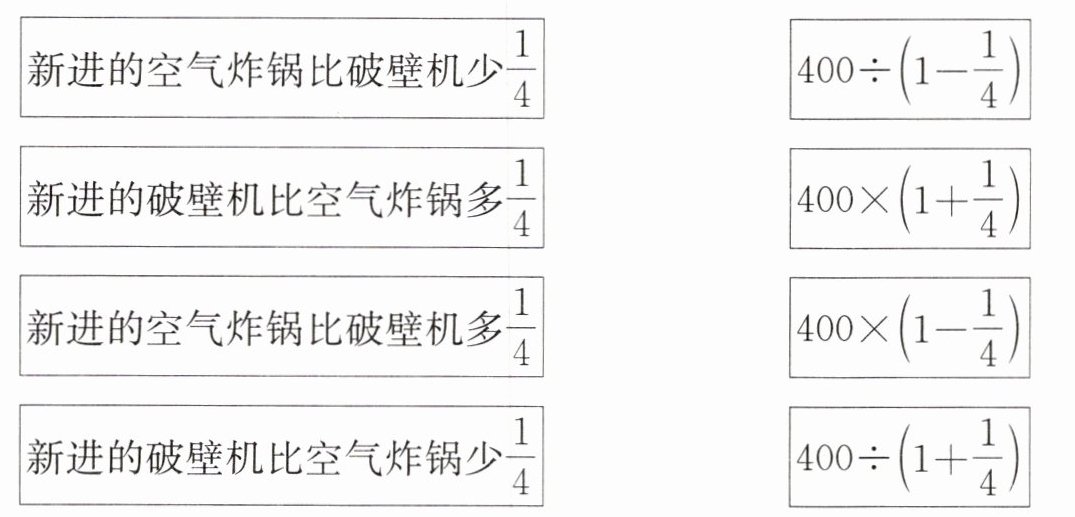 1. 家电商城新进破壁机400台。( ),新进的空气炸锅有多少台?连一连,把相应的条件和算式连接起来。