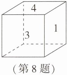 8. 如图,已知一个正方体的六个面上分别写着6个连续的整数,且相对面上两个数的和相等. 图中所能看到的数是1,3和4,则这6个整数的和是( )