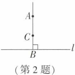 2. 如图,因为直线$ AB \perp l $于点B,$ BC \perp l $于点B,所以直线AB和BC重合,则其中蕴含的数学原理是( )