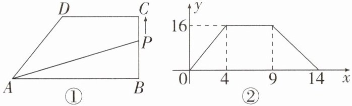 21. (8分)如图①,在直角梯形$ABCD$中,动点$P从B$点出发,沿$B→C→D→A$匀速运动,设点$P运动的路程为x$,$\triangle ABP的面积为y$,图象如图②所示.