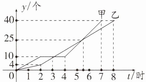 20. (8分)某车间的甲、乙两名工人分别同时生产同种零件,他们一天生产零件$y$(个)与生产时间$t$(时)的函数关系如图所示.