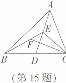 15. 如图,在△ABC中,D,E分别是BC,AD的中点$,BF= 2EF,S_{△ABC}= 10,$则△CEF的面积为______.