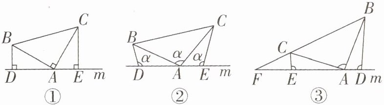 (2)结论仍然成立,证明如下:因为∠BDA=∠BAC=α,所以∠DBA+∠BAD=∠BAD+∠CAE=180°−α,即∠CAE=∠ABD.因为∠ABD=∠CAE,∠BDA=∠CEA,AB=AC,所以△ABD≌△CAE(AAS),所以AE = BD,AD=CE,所以DE=AE+AD=BD+CE,所以DE=BD+CE.