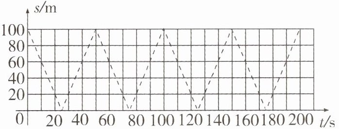 16. 甲、乙两人在 100 米直道$AB$上练习匀速往返跑,若甲、乙分别从$A$,$B$两端同时出发,分别到另一端点处掉头,掉头时间不计,速度分别为 5 m/s 和 4 m/s. 乙离$A端的距离s$(单位:m)与运动时间$t$(单位:s)之间的关系$(0 \leq t \leq 200)$如图虚线所示,则甲、乙两人第 7 次相遇时$t$的值是______.