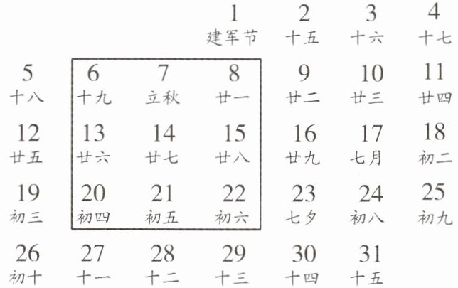 6. 如图是某月的月历表,在此月历表上可以用一个长方形圈出$ 3 × 3 $个位置相邻的9个数(如6,7,8,13,14,15,20,21,22).若圈出的9个数中,最大数与最小数的和为32,则这9个数的和为( )