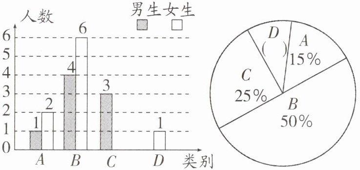 (3)在此次调查中,小平属于D类.为了进步,她请杨老师从被调查的A类学生中随机选取一位同学,和她进行“一帮一”的课后互助学习.请求出所选的同学恰好是一位女同学的概率.