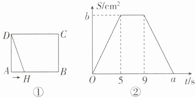 19. 动点H以每秒1厘米的速度沿图①的边框(边框拐角处都互相垂直)按从A-B-C-D的路径匀速运动,相应的$ \triangle HAD 的面积 S(cm^{2}) 与时间 t(s) $的关系图象如图②,已知$ AD = 4cm $,设点H的运动时间为$ t s $.