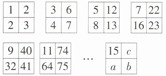 270 解析:经过观察,每个“田”左上角数字依此是1,3,5,7等奇数,此位置数为15时,恰好是第8个奇数,即此“田”字为第8个。观察每个“田”字左下角数据,可以发现,规律是$2,2^{2},2^{3},2^{4}$等,则第8个“田”字左下角的数为$2^{8}$。观察左下角和右上角,每个“田”字的右上角数字依次比左下角多0,2,4,6等,到第8个“田”字右上角数字比左下角多14,则$c = 2^{8}+14 = 270$。