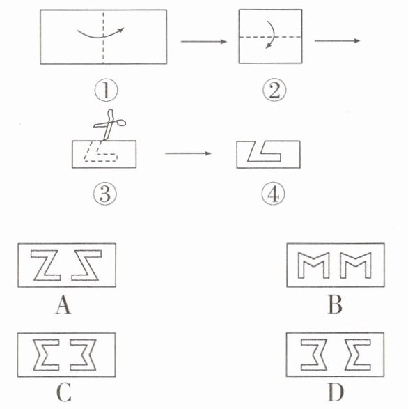 4. 一长方形纸片按图中①、②所示的方式对折两次后,再按图③中的虚线裁剪,则图④中的纸片展开铺平后的图形是( )