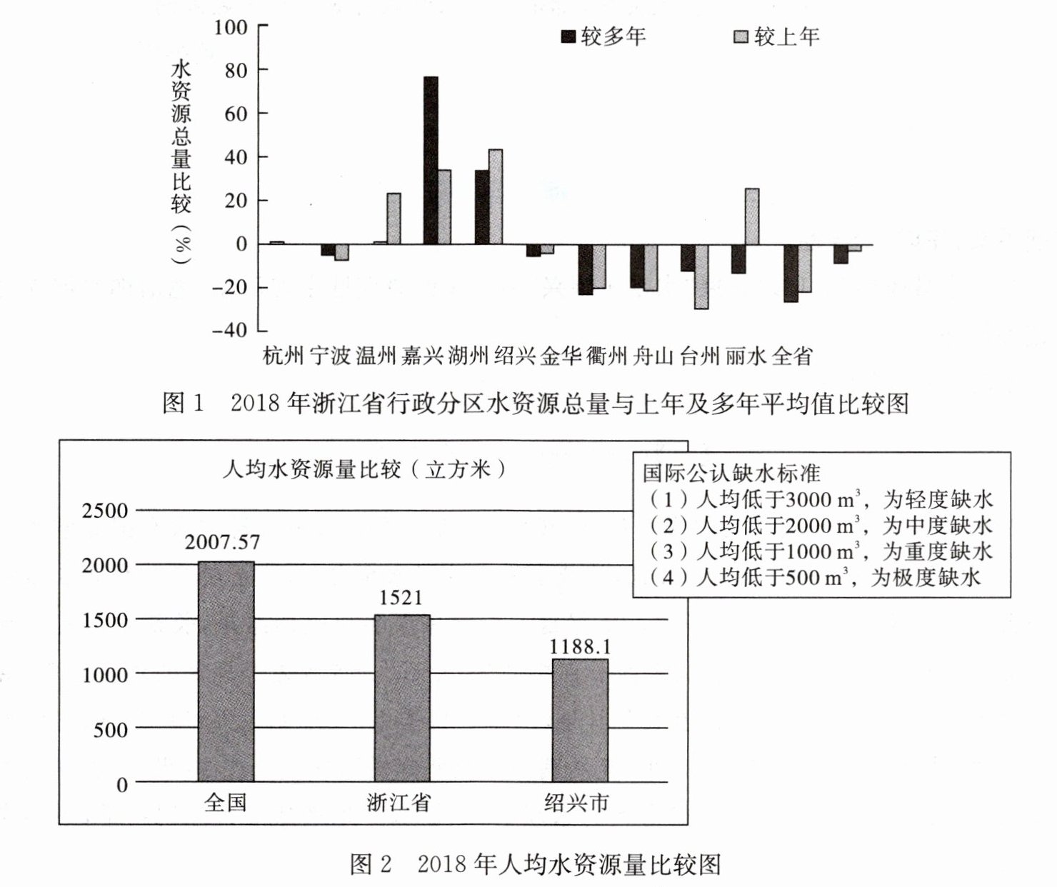 结论1:2018年绍兴市人均水资源拥有量低于全国、全省平均水平,根据国际公认缺水标准,绍兴属于中度缺水地区。