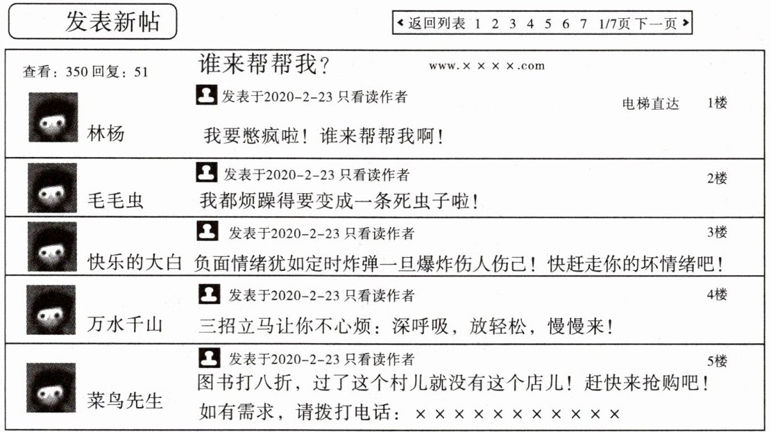材料三 2020年初,新冠病毒肆虐,中小学生不得不在线上学习。还不到半个月,林杨同学就憋闷得慌,他在贴吧发了一条求助信息,很快收到网友跟帖。