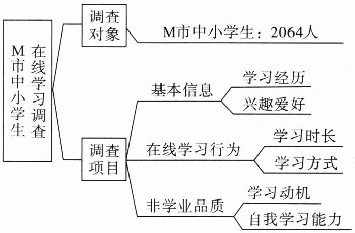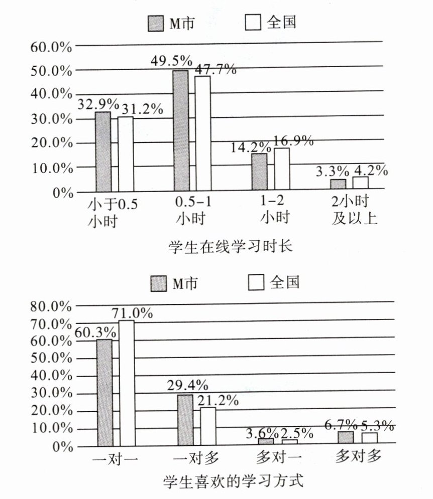 解:M市对2064名中小学生进行在线学习调查,涵盖基本信息、在线学习行为、非学业品质等项目。从学习时长看,M市学生在线学习时长在0.5 - 1小时占比49.5%,全国为47.7%;学习方式上,M市60.3%学生喜欢一对一,全国71.0%。通过列数字、作比较等说明方法,呈现M市中小学生在线学习情况。