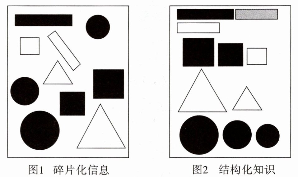有同学常为这样的事而苦恼,觉得老师教的知识都记住了,但考试时却不能正确作答。这是为什么呢?原因可能是这些知识在他的头脑中是散乱的、碎片化的(如图1),因此答题时不能准确提取相关知识,或提取出错。如果你头脑中的知识是有规律、成体系的结构化知识(如图2),在运用时就能准确提取了。因为我们的大脑处理不了太多零散复杂的信息,大脑更喜欢结构化的信息。如何让碎片化的信息结构化呢?这就必须对散乱的信息进行梳理、归纳、整合。