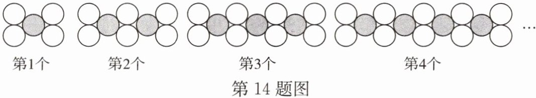 14. (2023·山西中考)下图是一组有规律的图案,它是由若干个大小相同的圆片组成的。第1个图案中有4个白色圆片,第2个图案中有6个白色圆片,第3个图案中有8个白色圆片,第4个图案中有10个白色圆片……依此规律,第$n$个图案中有____个白色圆片。(用含$n$的代数式表示)