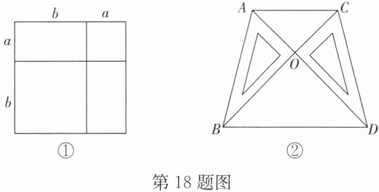 18. (2024·六安)我们已经知道,通过计算几何图形的面积可以表示一些代数恒等式,如图①,可以得到$(a+b)^{2}= a^{2}+2ab+b^{2}$。