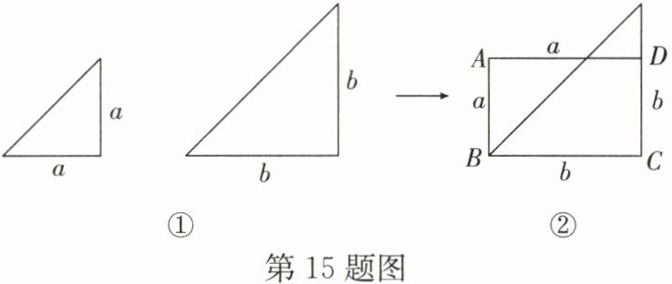 用直角边长分别为a和b的两个等腰直角三角形进行拼图,由图①得到图②。