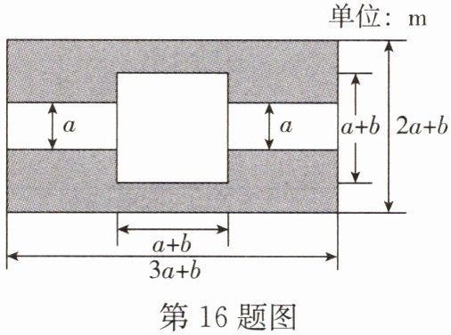 16. 如图,某市有一块长为$(3a+b)m$、宽为$(2a+b)m$的长方形地块,规划部门计划将阴影部分进行绿化,中间修建一座雕像,左右两边修两条宽为$am的道路(a>0,b>0)$。