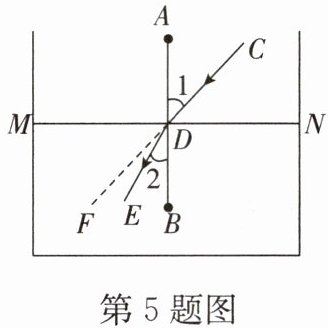 5. [跨学科融合]如图,当光线从空气中射入某种液体中时,光线的传播方向发生了变化,在物理学中这种现象叫作光的折射。如图,$AB⊥液面MN于点D$,一束光线沿$CD$射入液面,在点$D$处发生折射,折射光线为$DE$,点$F为CD$的延长线上一点。若入射角$∠1= 43^{\circ}$,折射角$∠2= 29^{\circ}$,则$∠EDF$的度数为 ()