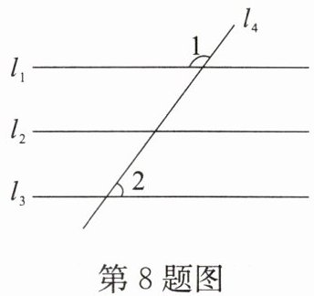 8. 如图,直线$l_{1}$,$l_{2}$,$l_{3}被直线l_{4}$所截,若$l_{1}// l_{2}$,$l_{2}// l_{3}$,$∠1= 126^{\circ}32'$,则$∠2$的度数是______。