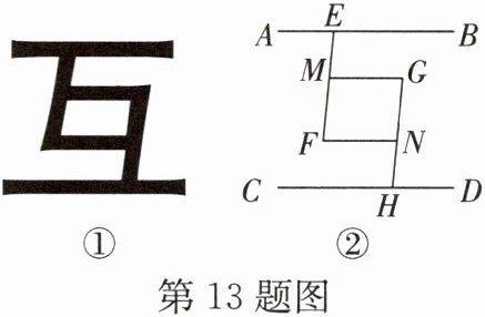 13. [跨学科融合]中国汉字博大精深,方块文字智慧灵秀,奥妙无穷。如图①所示的是一个“互”字,如图②所示的是由图①抽象的几何图形,其中$AB// CD$,$MG// FN$,点$E$,$M$,$F$在同一直线上,点$G$,$N$,$H$在同一直线上,且$∠EFN= ∠G$。