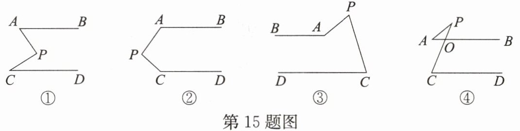 15. 如图,$AB// CD$,分别探讨下面4个图形中$\angle APC与\angle PAB$,$\angle PCD$的关系,请你从所得到的关系中任选一个加以说明。(可适当添加辅助线)