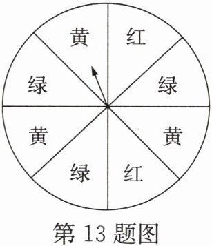 13. 一个转盘如图所示被平均分成了8个大小相同的扇形,颜色分为红、绿、黄三种。指针的位置固定,转动转盘后任其自由停止,其中的某个扇形恰好停在指针所指的位置(指针指向两个扇形的交线时,当作指向右边的扇形)。求下列事件的概率: