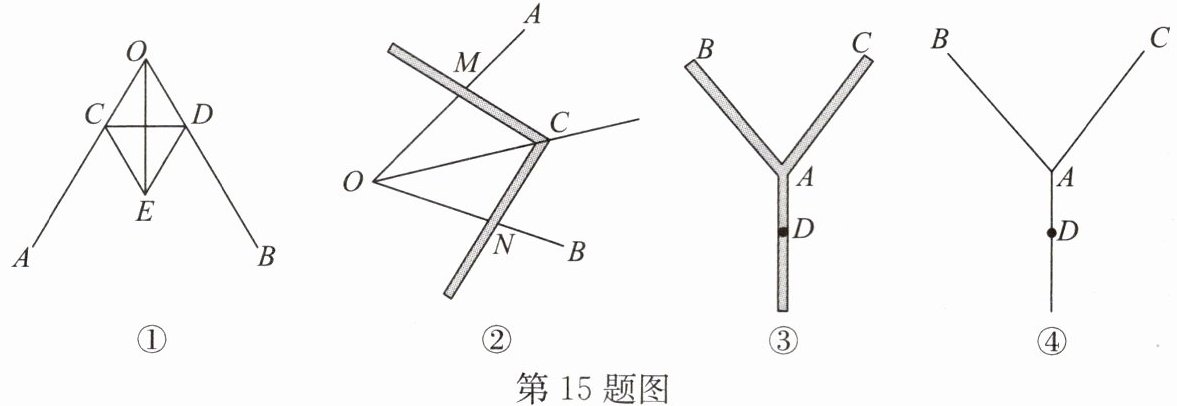 问题探究:(1)图①是古希腊数学家欧几里得所著的《几何原本》中给出的角平分线作图法:在 $ OA $ 和 $ OB $ 上分别取点 $ C $ 和点 $ D $,使得 $ OC = OD $,连接 $ CD $,以 $ CD $ 为边作等边三角形 $ CDE $,连接 $ OE $,则 $ OE $ 就是 $ \angle AOB $ 的平分线。请写出 $ OE $ 平分 $ \angle AOB $ 的依据:____。